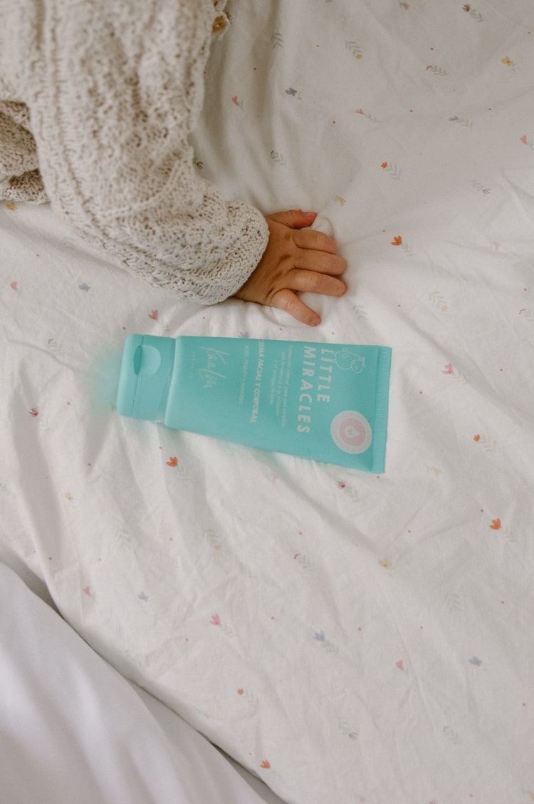 Le aplico la crema natural que le envuelve en un abrazo invisible. Con cada toque, la crema nutre y protege su piel, dejándola suave y cuidada.